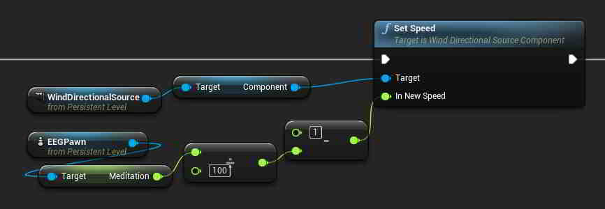 There's not much to say here to be honest. WindDirectionalSource's Speed value can be a decimal value from 0 to 1, so relevant values were clamped and adjusted accordingly before being set on Event Tick. In the above level blueprint snippet, wind speed is set to the inverse of the BrainLink's Meditation readings (the more calm you are, the less windy it will be). Minimum and maximum gusts were also set to 0 for the purposes of this setup so that wind speeds would not seemingly fluctuate randomly.